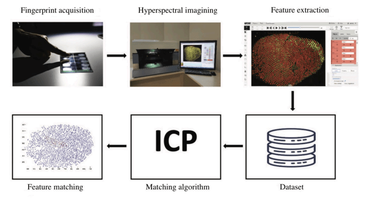 Fingerprints are one of the most important scientific proof instruments in solving forensic cases. Identification in fingerprints consists of three levels based on the flow direction of the papillary lines at the first level, the minutiae points at the second level, and the pores at the third level. The inadequacy of existing imaging systems in detecting f ingerprints and the lack of pore details at the desired level limit the widespread use of third-level identification. The fact that fingerprints with images based on pores in the unsolved database are not subjected to any evaluation criteria and remain in the database reveals the importance of the study to be carried out. In this study, different from classical f ingerprint identification methods, a direct pore-based identification system for fingerprint matching is proposed with the dataset created by using the Docucenter Nirvis device and Projectina Image Acquisition-7000 software as a hyperspectral imaging system where pores were visualized more clearly. Although difficult from an operational perspective, the pores in the 800 fingerprints in the database were manually marked for the accuracy of the results. Next, by using a scoring based on iterative closest point algorithm, latent fingerprints were found. Results suggest that the higher the number of pores examined and the more accurately the pores were marked, the higher the hit score. At the same time, query results showed that the scores of other sequential fingerprints in the database which came after the matching fingerprint were even lower.