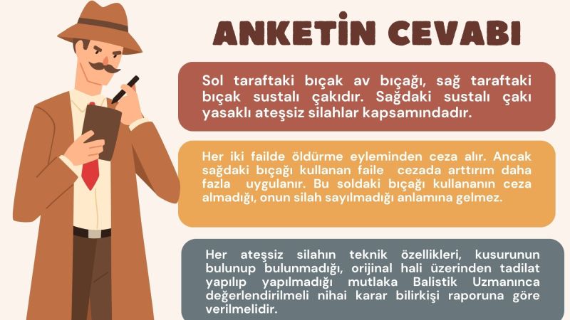Otomatik açma sağlayan mandalı olan sustalı çakı yasaklı olduğu için daha fazla ceza alacak. Soldakinde dediğiniz gibi oluk işlevi görecek bir girinti olsaydı o da yasaklılar kapsamında olacaktı.